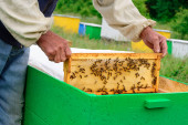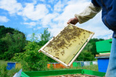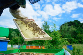 Pszczelarz bada pszczoły w plastrach miodu. W rękach plastra miodu z miodem