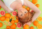Ritratto di donna sorridente caucasica attraente isolata su bianco studio girato con arance