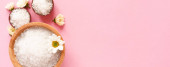 Uzdrowiskowa kompozycja płaska. Sól morska w słoikach, kwiat na różowym tle. Copyspace, widok z góry. Koncepcja opieki domowej, relaks i odpoczynek.