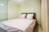 MINSK, BELARUS - WRZESIEŃ, 2020: Wnętrze nowoczesnej luksusowej sypialni w apartamentach typu studio w jasnym kolorze