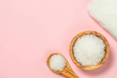 Uzdrowiskowa kompozycja płaska. Sól morska w słoikach, masaż drewnianą szczotką, kwiat na różowym tle. Copyspace, widok z góry. Koncepcja opieki domowej, relaks i odpoczynek.