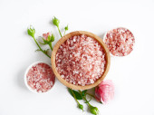 Uzdrowiskowa kompozycja płaska. Sól morska, ręcznik kąpielowy, kwiat na białym tle. Copyspace, widok z góry. Koncepcja opieki domowej.