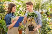 młody dorosły pracownik ogród w fartuch przy użyciu cyfrowego tabletu w cieplarnianych