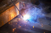 Zbliżenie obrazu Arc spawania dwóch kawałków stali podczas budowy
