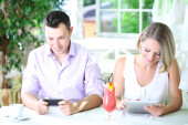 młoda kobieta i mężczyzna przy użyciu komputera typu tablet