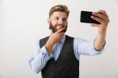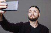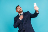 Zdjęcie "biznesmen z telefonem w ręku robi zdjęcie selfie" może być wykorzystywane do celów osobistych i komercyjnych zgodnie z warunkami zakupionej licencji Royalty-free. Obraz jest dostępny do pobrania w jakości wysokiej rozdzielczości do 5760x3840.