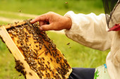 Pszczelarz trzymający plaster miodu pełen pszczół. Pszczelarz w ochronnej odzieży roboczej badający szkielet plastra miodu w pasiece. Koncepcja pszczelarstwa