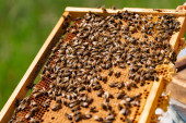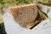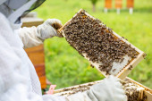 Pszczelarz trzymający plaster miodu pełen pszczół. Pszczelarz w ochronnej odzieży roboczej badający szkielet plastra miodu w pasiece. Koncepcja pszczelarstwa