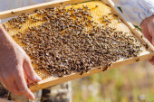 Zdjęcie "Pszczelarz trzymający plaster miodu pełen pszczół. Pszczelarz w ochronnej odzieży roboczej badający szkielet plastra miodu w pasiece. Koncepcja pszczelarstwa" może być wykorzystywane do celów osobistych i komercyjnych zgodnie z warunkami zakupionej licencji Royalty-free. Obraz jest dostępny do pobrania w jakości wysokiej rozdzielczości do 5760x3840.