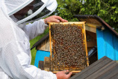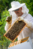 Zdjęcie "Pszczelarz rozpatruje pszczoły w plastrach miodu ze szkłem powiększającym. Pszczelarstwo" może być wykorzystywane do celów osobistych i komercyjnych zgodnie z warunkami zakupionej licencji Royalty-free. Obraz jest dostępny do pobrania w jakości wysokiej rozdzielczości do 5760x3840.