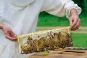 Doświadczony pszczelarz dziadek uczy swojego wnuka dbania o pszczoły. Pszczelarstwo. Przekazywanie doświadczeń