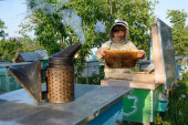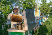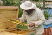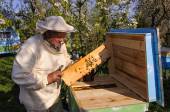 Pszczelarz kontrolujący ul i ramę grzebienia. Pszczelarstwo
