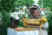 Doświadczony pszczelarz dziadek uczy swojego wnuka dbania o pszczoły. Pszczelarstwo. Koncepcja transferu doświadczeń