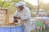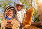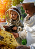 Doświadczony pszczelarz dziadek uczy swojego wnuka dbania o pszczoły. Pszczelarstwo. Koncepcja transferu doświadczeń
