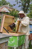 Pszczelarz kontrolujący ul i ramę grzebienia. Pszczelarstwo