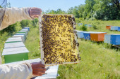 Apiary. Pszczelarz pracuje w pobliżu uli. Pszczoły. Pszczoła z pszczołami