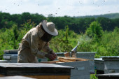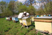 Pszczoły pracują nad plastrem miodu. Wzór komórek miodu. Pszczelarstwo