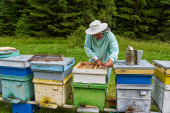 Pszczelarz umieszcza ul w nowych ramach dla miodu. Plaster miodu. Pszczelarstwo
