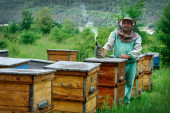 Zdjęcie "Pszczelarz pracuje w pasiece. Apiary" może być wykorzystywane do celów osobistych i komercyjnych zgodnie z warunkami zakupionej licencji Royalty-free. Obraz jest dostępny do pobrania w jakości wysokiej rozdzielczości do 5760x3840.