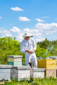 Zdjęcie "Pszczelarz pracuje w pasiece. Apiary" może być wykorzystywane do celów osobistych i komercyjnych zgodnie z warunkami zakupionej licencji Royalty-free. Obraz jest dostępny do pobrania w jakości wysokiej rozdzielczości do 5760x3840.