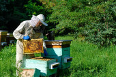 Pszczelarz wyjmuje z ula plaster miodu z pszczołami. Pszczelarstwo