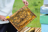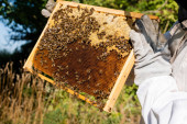 Pszczelarz trzymający plaster miodu pełen pszczół. Pszczelarz w ochronnej odzieży roboczej badający szkielet plastra miodu w pasiece. Koncepcja pszczelarstwa