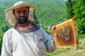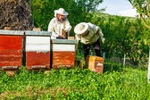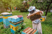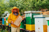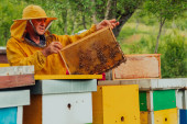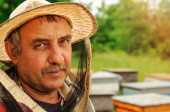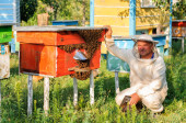 Pszczelarz w pasiece niedaleko uli. Pszczelarstwo. Apiary