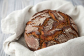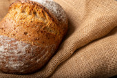 świeżo upieczony chleb żytni w lnianej tkaninie na drewnianym tle
