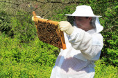 Pszczelarz patrzy przez plaster miodu z pszczołami w pobliżu ula. Pszczelarstwo