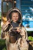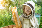 Chłopiec pszczelarz pracuje w ulu w ulu. Apiary. Pszczoły Pszczelarstwo