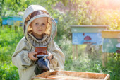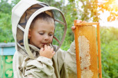 Pszczelarz trzyma w rękach plaster miodu ze świeżym miodem. Pszczelarstwo. Świeży miód