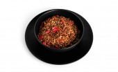 Dwa brązowe kubki z przyprawami: ziele angielskie i mieszanka ziół, na białym tle.