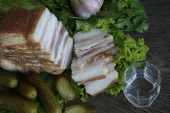 Tradycyjna ukraińska i rosyjska przystawka podczas posiłku. Jedzenie podczas picia alkoholu. Wódka i sól, tłuszcz wieprzowy i ogórki marynowane na ciemnym drewnianym tle.