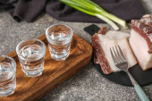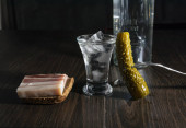 Tradycyjna ukraińska i rosyjska przystawka podczas posiłku. Jedzenie podczas picia alkoholu. Wódka i sól, tłuszcz wieprzowy i ogórki marynowane na ciemnym drewnianym tle.