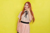 podekscytowany młoda kobieta patrząc w dół, wielce zaskoczony