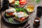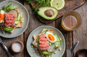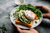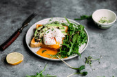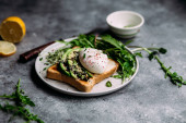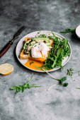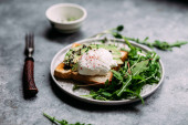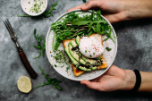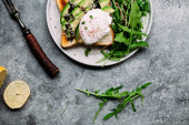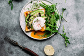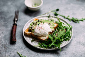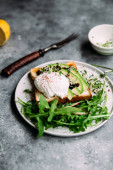 Poached egg with avocado salad, microgreen and arugula