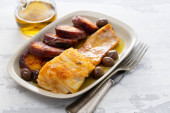 Schab gulasz z owocami.Pieczone mięso z jabłkami w naczyniu do pieczenia