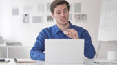 Młody biznesmen i programista w zielonej koszuli odczuwa stres po ciężkiej pracy, siedząc przy biurku w nowoczesnym gabinecie razem z koleżanką w tle. Przedsiębiorstwa rozpoczynające działalność