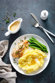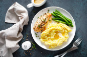 Pieczone piersi kurczaka z zieloną fasolą, gotowane ziemniaki puree i sos