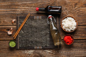 Talerz pysznej sałatki ryżowej z warzywami na ciemnym drewnianym tle