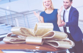 Młodzi ludzie z kieliszkami szampana i prezentem na białym tle. Szczęśliwego Bliskiego Roku i Wesołych Świąt