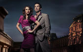 Młoda atrakcyjna para i brytyjski kot w ciemnym pokoju