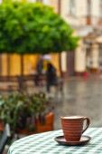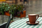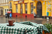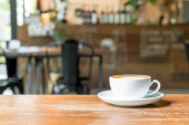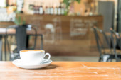 Biały kubek na drewnianej desce. Zamazane wnętrze baru na tle. Wolne miejsce przy kawie.