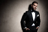atrakcyjny elegancki mężczyzna w czarnym smokingu, muszki i chusteczki stoi i pewnie pozowanie na jasnoszarym tle w studio