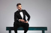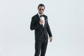 elegancki młody pan młody w czarnym smokingu z muszką i chusteczką trzymając się za rękę w modnej pozie i stojąc na jasnoszarym tle w studio