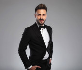 Zdjęcie "elegancki młody pan młody w czarnym smokingu z muszką i chusteczką trzymając się za rękę w modnej pozie i stojąc na jasnoszarym tle w studio" może być wykorzystywane do celów osobistych i komercyjnych zgodnie z warunkami zakupionej licencji Royalty-free. Obraz jest dostępny do pobrania w jakości wysokiej rozdzielczości do 5760x3840.