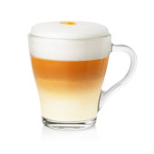 Przezroczysty szklany kubek kawy espresso macchiato z pianką mleczną wyizolowany na białym tle.