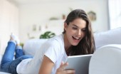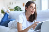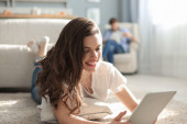 Zdjęcie "Uśmiechnięta młoda kobieta siedzi na kanapie z laptopem i rozmawia z przyjaciółmi" może być wykorzystywane do celów osobistych i komercyjnych zgodnie z warunkami zakupionej licencji Royalty-free. Obraz jest dostępny do pobrania w jakości wysokiej rozdzielczości do 5760x3840.