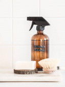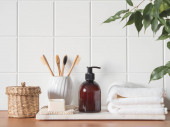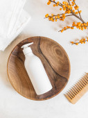 Brązowa makieta do butelek produktów kosmetycznych i różnych akcesoriów do kąpieli. Z przodu. skopiować przestrzeń. Leżeć płasko. makieta produktu kosmetycznego.
