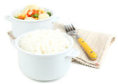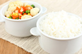 ugotowany ryż z warzywami na drewnianym stole z bliska